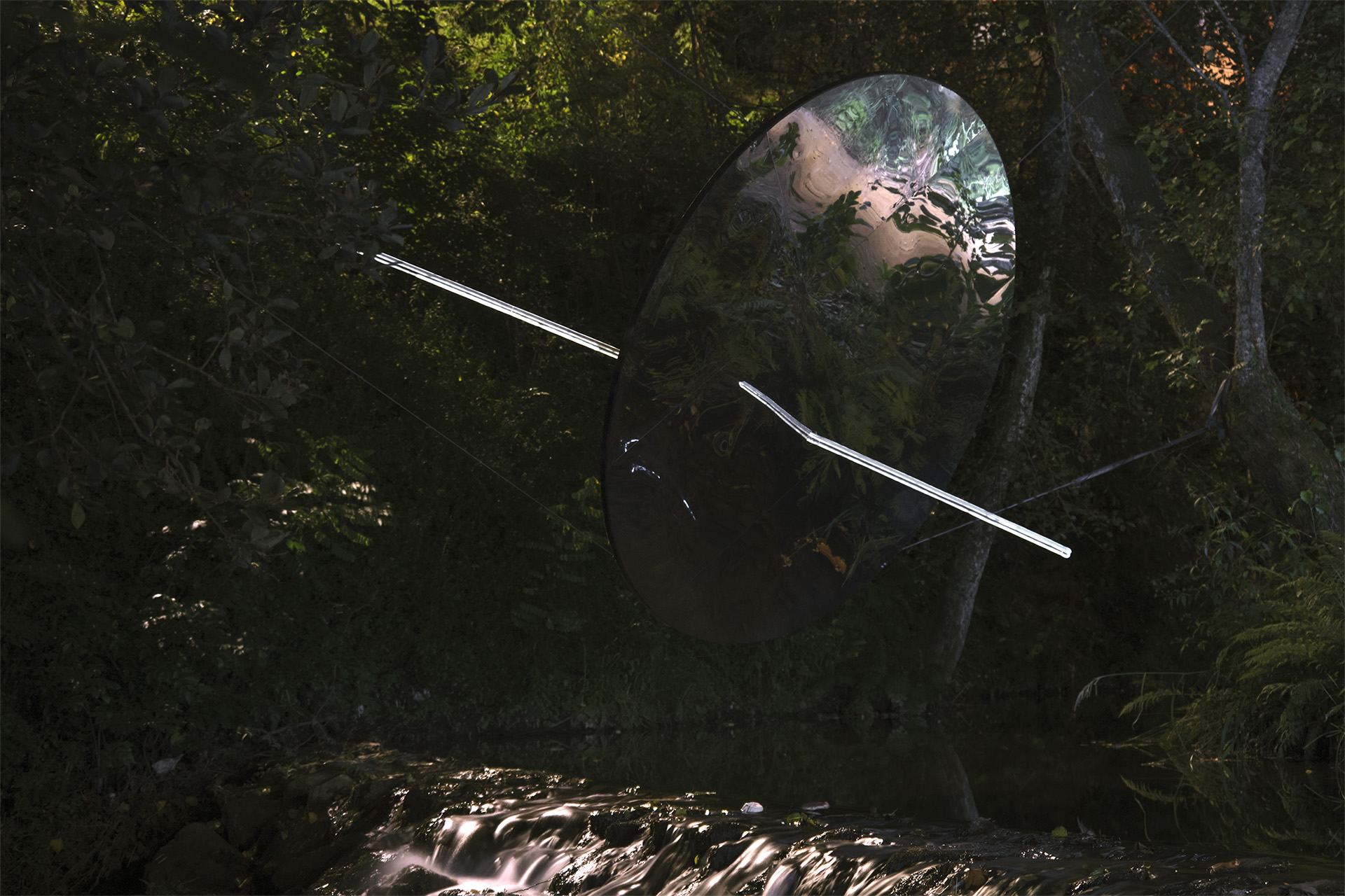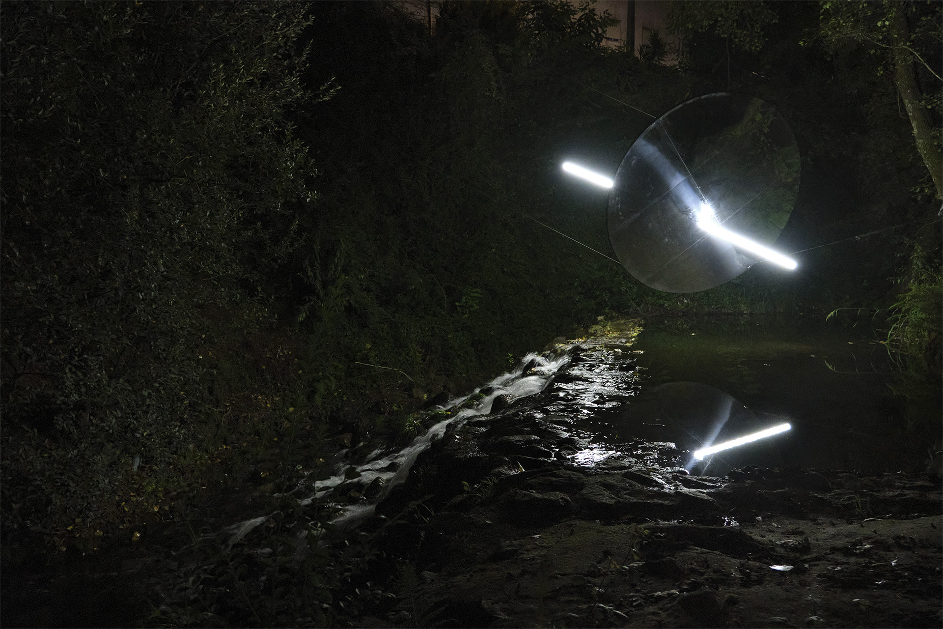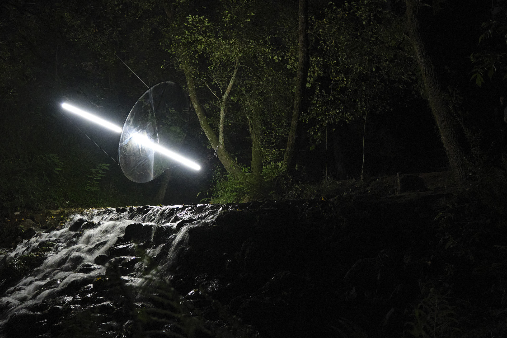 A circular portal-mirror, 3 meters in diameter, suspended among the existing vegetation, above a practically immobile water mirror. Crossing this plane, which reflects its surroundings, is a 5 meter long line of light. The suspended, crystallized mirror, whose image is only changing depending on the observer's point of view, while the liquid mirror is constantly misshapen at the whim of the river's current. Water, glass and light, three elements whose geometries and relative positions reverberate - to oneself and to the surroundings - infinitely. The light is in sync with an artificial soundscape, added to the natural sound of the place: a track composed by the artist Ricardo Nogueira Fernandes, entitled 'Circle'.