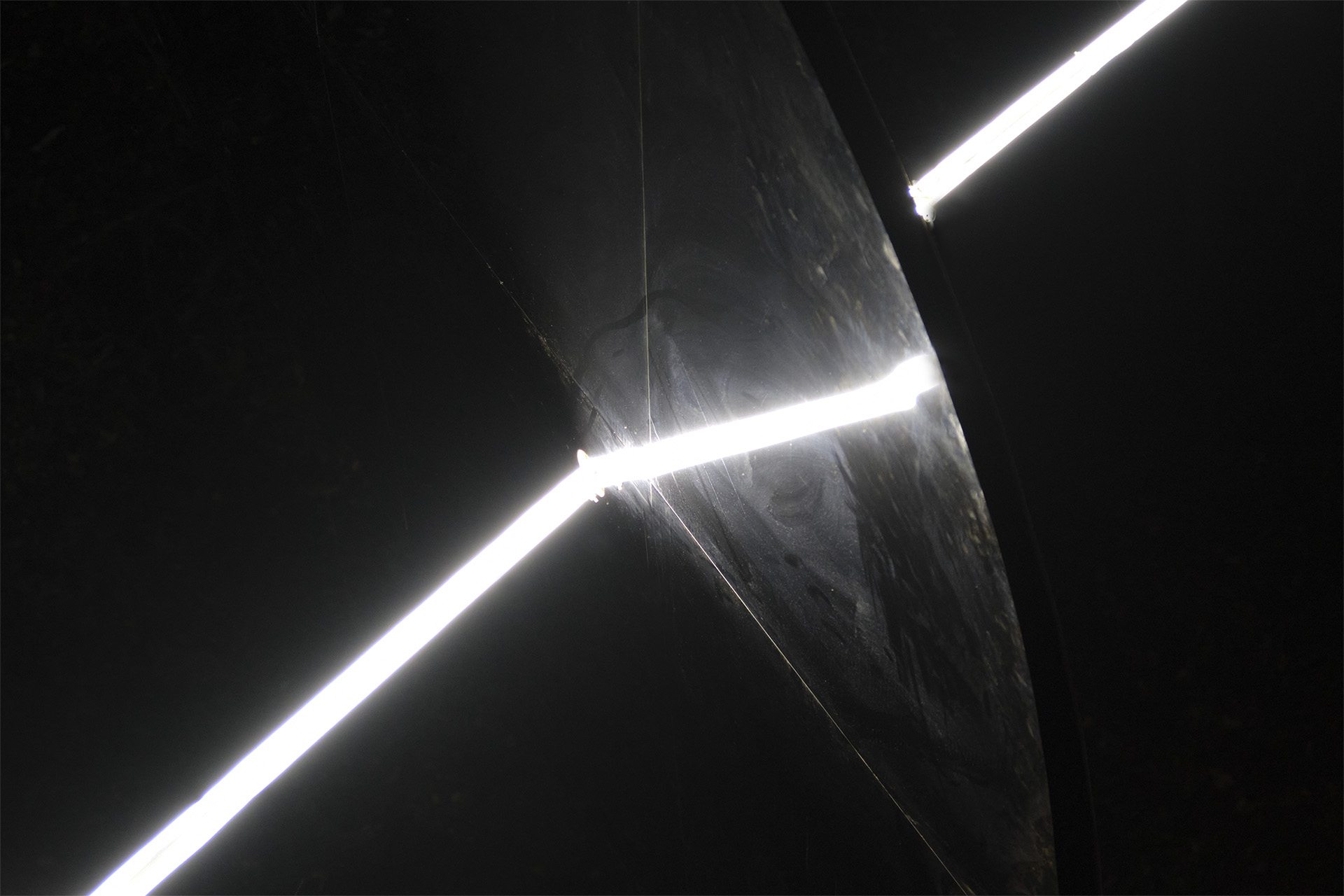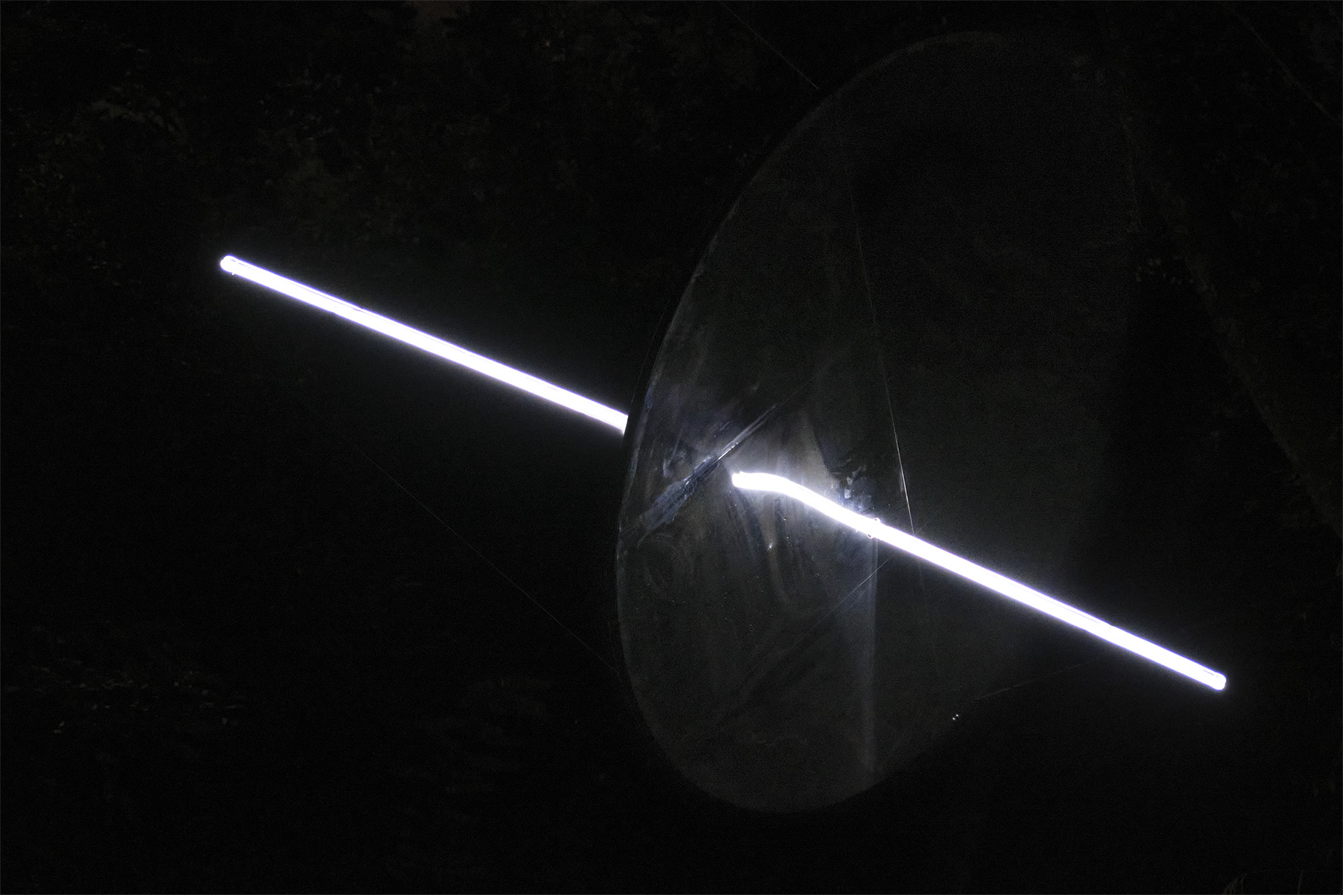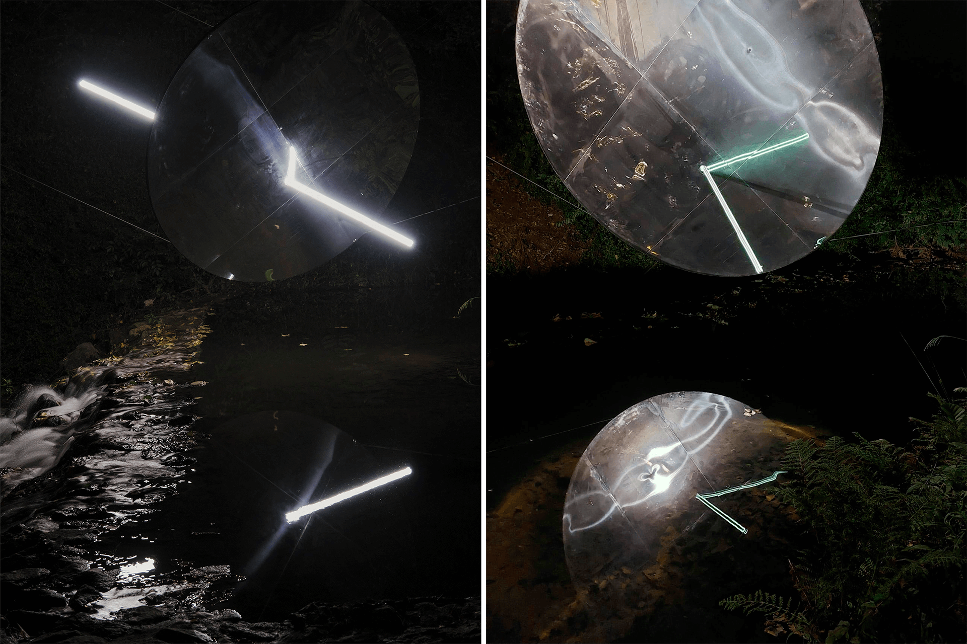 A circular portal-mirror, 3 meters in diameter, suspended among the existing vegetation, above a practically immobile water mirror. Crossing this plane, which reflects its surroundings, is a 5 meter long line of light. The suspended, crystallized mirror, whose image is only changing depending on the observer's point of view, while the liquid mirror is constantly misshapen at the whim of the river's current. Water, glass and light, three elements whose geometries and relative positions reverberate - to oneself and to the surroundings - infinitely. The light is in sync with an artificial soundscape, added to the natural sound of the place: a track composed by the artist Ricardo Nogueira Fernandes, entitled 'Circle'.