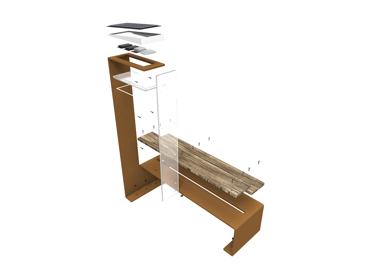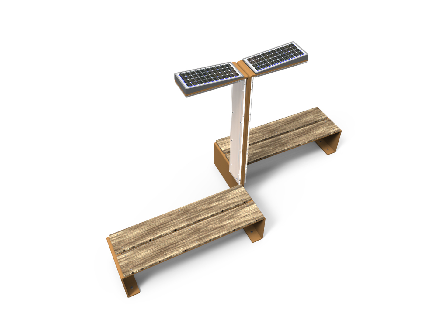 top of the bench, stored in batteries which charge LED system, movement sensors, and USB plugs.